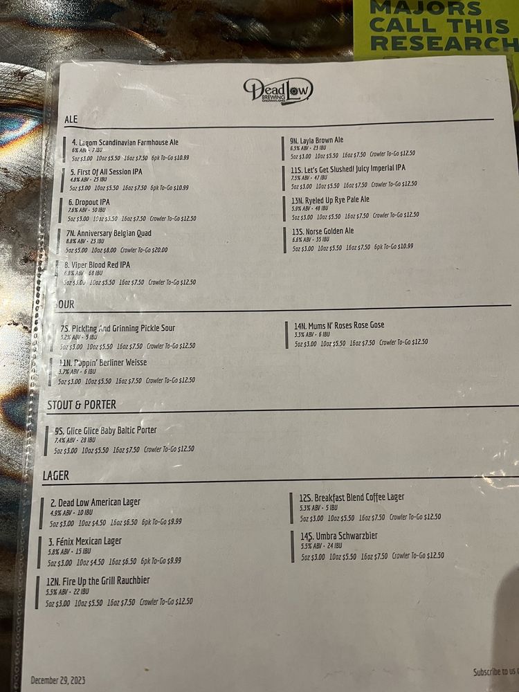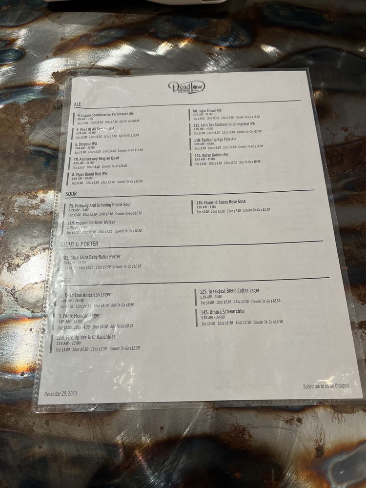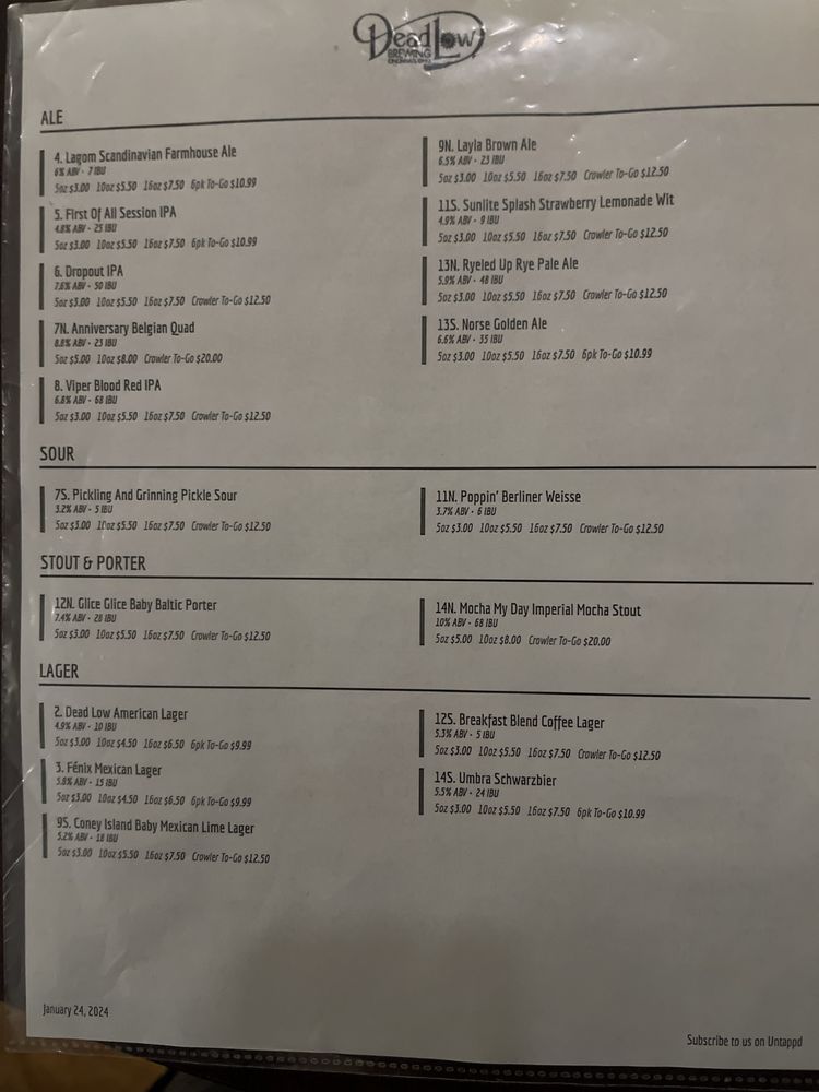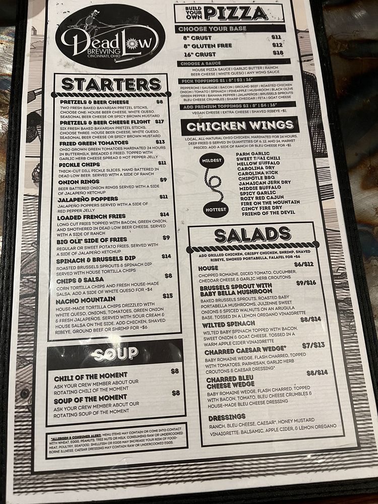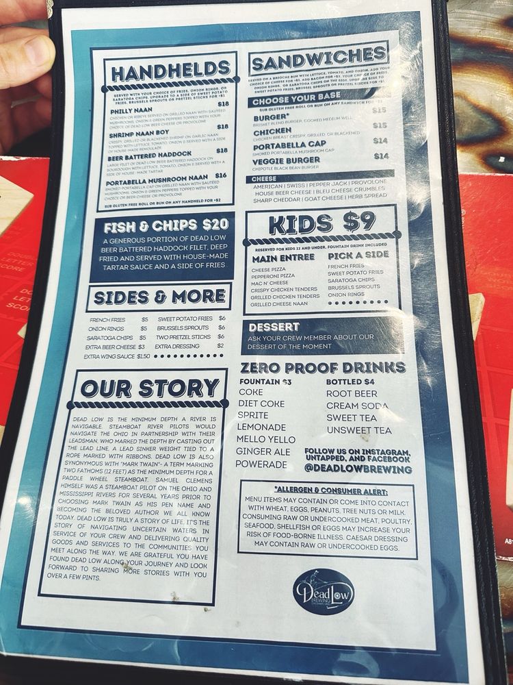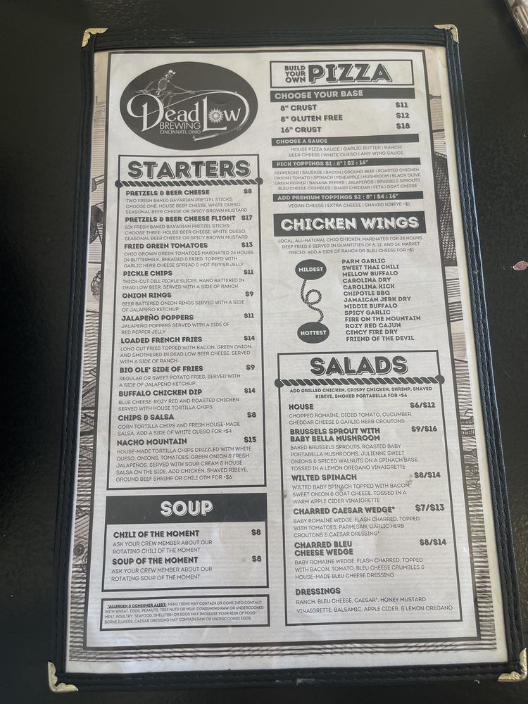 Dead Low Brewing, located in Cincinnati, Ohio, offers a diverse menu with vegan options and a wide range of amenities. Customers rave about the delicious food, including options like shrimp naan, pickle chips, brussels sprouts, fish and chips, dry rubbed wings, and cheese pizza. The craft beers receive high praise, with highlighted favorites including the pickle sour and American Lager. Customers appreciate the friendly service and inviting atmosphere, making it a great spot to watch a game or enjoy a drink. The expansive space features a central bar and plenty of seating, including outdoor options. With a variety of food and drink options, Dead Low Brewing is a must-visit spot for food and beer enthusiasts alike.